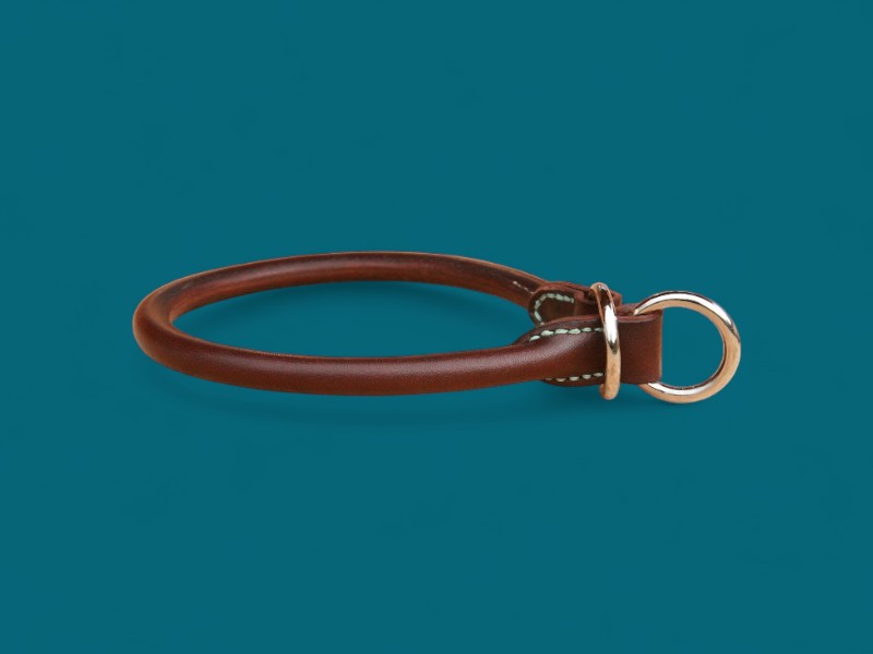 Comme il porte une appellation plutôt péjorative,  je préfère  parler d’un modèle de collier pour chien en cuir cousu rond dit “coulissant”. En effet, ce type de collier est de plus en plus plébiscité pour son aspect épuré, un collier de chien en cuir cousu rond simple, élégant, avec peu de métal pour la partie bouclerie. Il est même parfois choisi comme un collier que le chien portera toujours en tombé sur l’encolure, sans même l’utilisation d’une laisse, Au détriment de sa fonction première, vouée à une éducation un peu ferme. D’un autre côté, et Il ne s’agit évidemment pas de la part de l’Atelier Napoléon de prôner l’étranglement, ce système peut quand même est utile en situation d’éducation, à condition de l’utiliser judicieusement et sans exagération. C’est un collier qui historiquement de par sa fonction coulissante sans blocage, permet de créer une sensation peu inconfortable lorsque le chien tire trop. A l’inverse le collier permettra d’avoir un port plus souple et “lâche” lorsque la marche sera au rythme du maître.