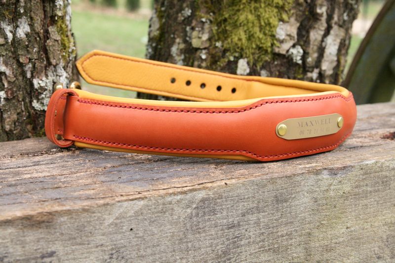 Collier Médaillon en cuir Cognac et moutarde. Une création en cuir rembourré reprenant la forme de notre modèle de modèle de collier Médaillon. Doublure grand confort – Surpiqûre rouge – plaque identification et bouclerie en laiton massif