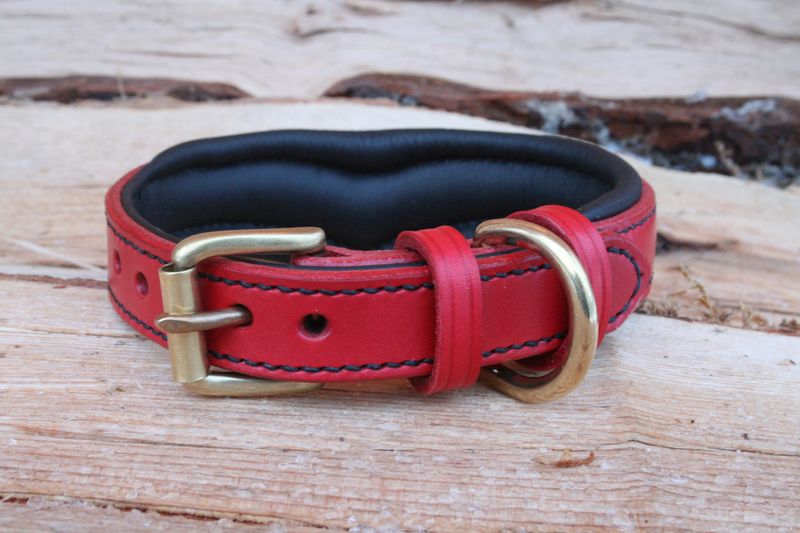 Important : Les cuirs dédiés à la confection des colliers étant parfois différents des cuirs destinés aux laisses, il faut s’attendre à une différence de teinte entre le cuir rouge principal du collier et celui de la laisse. La laisse est en général plus foncée. La doublure par contre est la même pour les deux créations. Cette différence va s’estomper à l’usage car le cuir du collier va foncer progressivement.